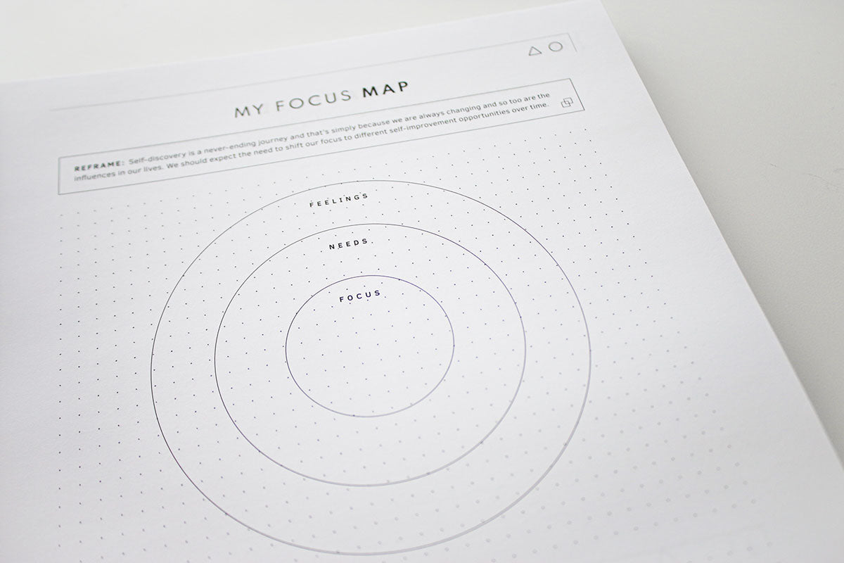 Step 1: Begin with the centre ring of the focus map diagram (labeled ‘focus’) and insert the ONE aspect of our life that you want to focus on for the month (you can take your answer from the bottom of the “My Focus” page or come up with something more specific).