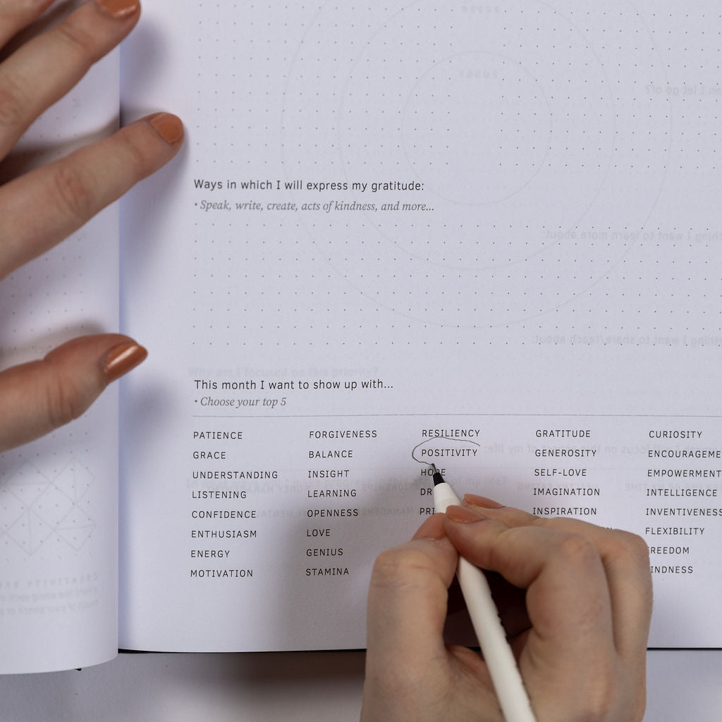 The ONE Book is an all-in-one tool for business owners, entrepreneurs, and leaders. This 365-page book guides you through a full year of planning, goal-setting, reflection and SO more. It is an interactive book that you are invited to (actually strongly encouraged to) write in, draw on, doodle over, and USE as a go-with-you-everywhere kind of book.